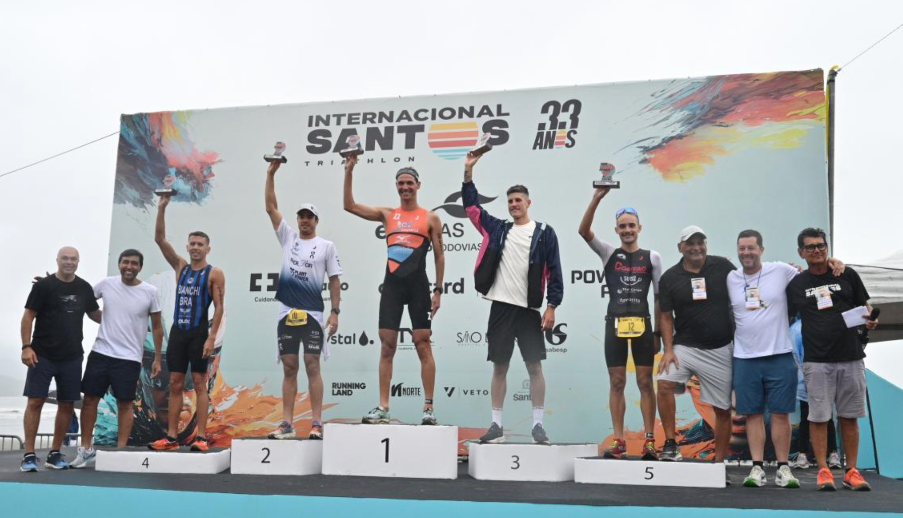 Debaixo de chuva os triatletas Reinaldo Colucci e Djenyfer Arnold foram os grandes campeões da 33ª edição do Triathlon Internacional de Santos, realizado na manhã deste domingo na praia do Boqueirão, em Santos, São Paulo.